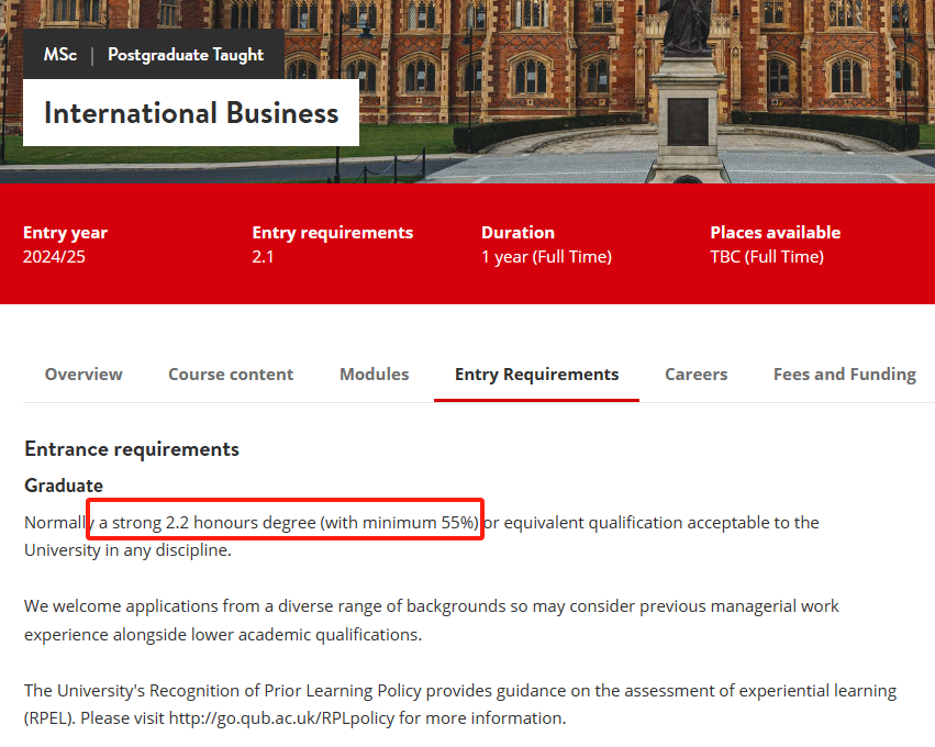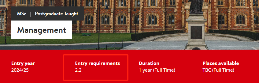 ② 除了国际商务硕士这个专业外,女王大学的 管理学硕士 也接受2:2成绩申请,其他商科硕士都需要2:1才能申请。