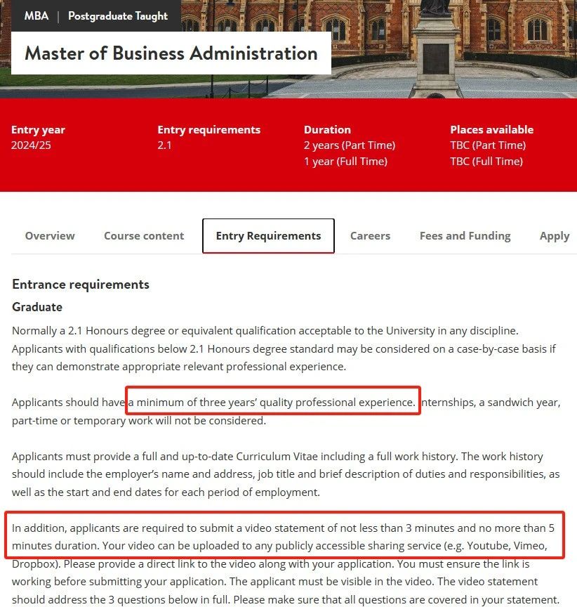 ③ 另外,女王大学的 MBA 录取要求也有所改变,工作经验要求改为3年(原为5年), 面试改为提供3-5分钟的视频 。