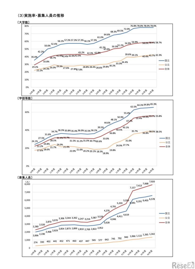 综合选拔”在64所国立大学(78.0%)、264所院系(65.3%)和41所公立大学(42.3%)、85所院系(38.5%)中进行。在全国范围内,宇都宫大学(数据科学管理、工程学)、千叶大学(信息和数据科学)、御茶水女子大学(共同创意工程学)、兵库教育大学(学校教育)和冈山大学(医学)等五所大学的六个学部). 在公共部门,旭川市立大学(经济、健康与福利学院)和高知工业大学(数据与创新学院)两所大学和三个学院将实施新的综合选拔流程。