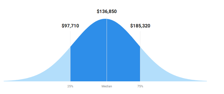 据统计,市场营销经理2019年薪资中位数为136,850美元。收入最高的25%年收入为185,320美元,而收入最低的25%收入为97,710美元。
