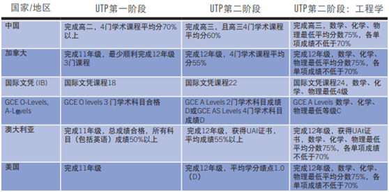入读UTP第二阶段一般要求圆满完成高三或同等学历 ,根据课程的不同,还有整体和单科成绩要求, 详细最低学术要求如下图 。录取评估是根据申请人的完整学术成绩进行,不同课程录取要求不同(点开查看大图)。