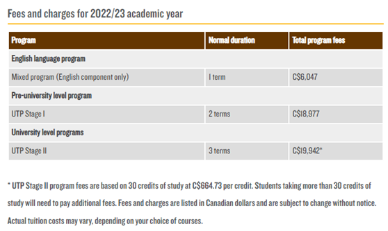 混合课程(仅英语课程部分,1个学期)为6047加币;UTP第一阶段课程(2个学期)学费为18977加币;UTP第二阶段(3个学期)为19942加币。