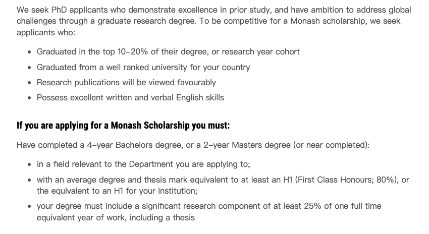 5.平均学位和论文分数至少相当于 H1(一等荣誉;80%),或相当于您所在院校的 H1;「不申请奖学金H2A(二等荣誉学位;75-79%)也有资格申请入学」