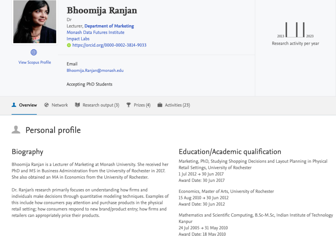Bhoomija Ranjan 是蒙纳士大学市场营销讲师。她于 2017 年获得罗切斯特大学工商管理学博士学位和硕士学位。她还获得了罗切斯特大学经济学硕士学位。