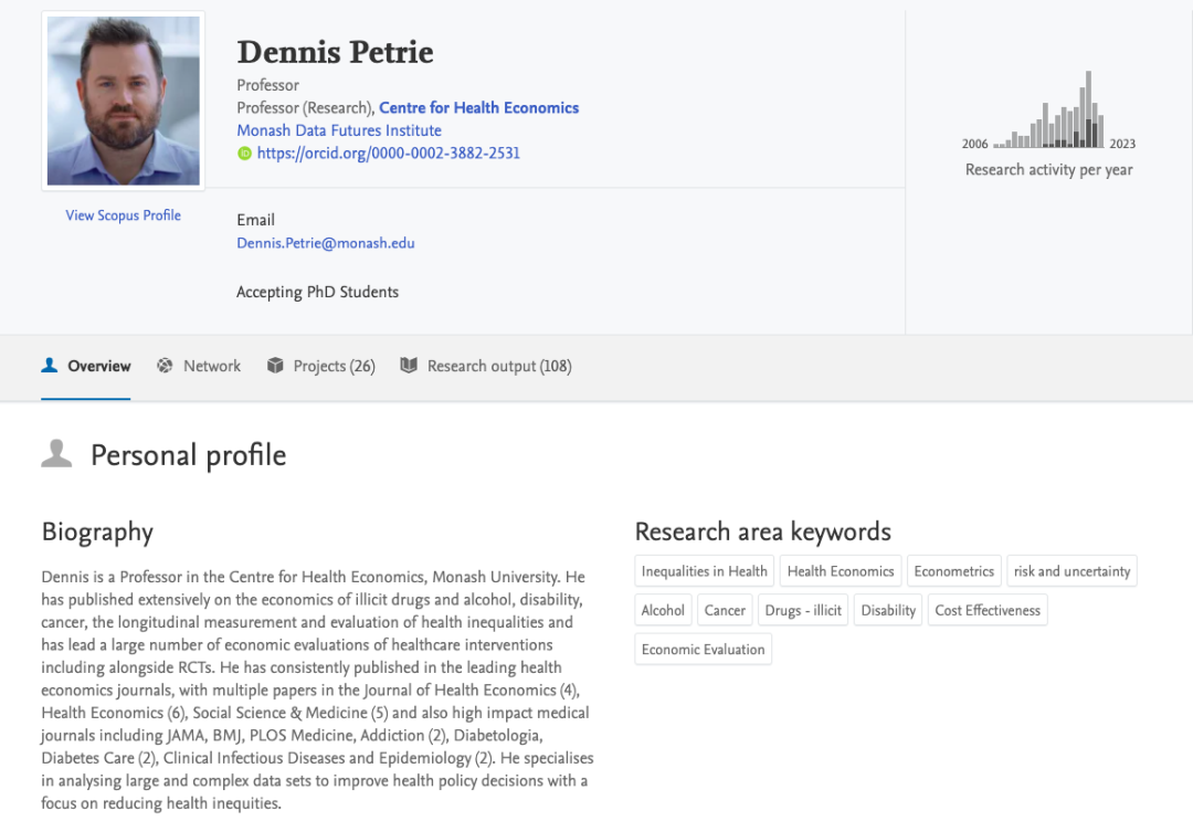 尼斯是蒙纳士大学健康经济学中心教授。他在违禁药物和酒精经济学、残疾、癌症、健康不平等的纵向测量和评估等方面发表了大量论文,并领导了大量医疗保健干预措施的经济评估工作,包括RCT。他一直在领先的卫生经济学期刊上发表论文,在《卫生经济学杂志》(4)、《卫生经济学》(6)、《社会科学与医学》(5)以及《美国医学会杂志》、《英国医学杂志》、《PLOS Medicine》、《Addiction》(2)、《Diabetologia》、《Diabetes Care》(2)、《Clinical Infectious Diseases》和《Epidemiology》(2)等高影响力医学期刊上发表过多篇论文。他擅长分析大型复杂数据集,以改善卫生政策决策,重点是减少卫生不公平现象。