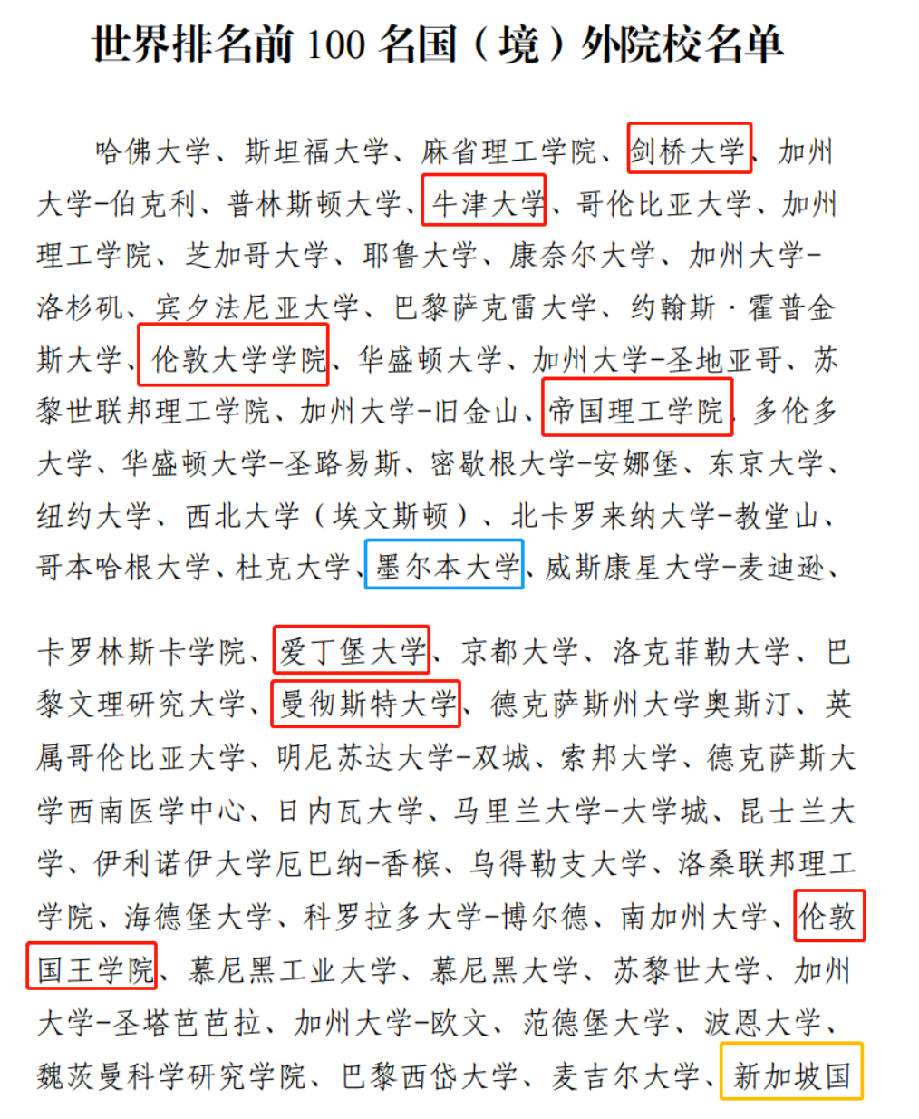 其中,符合要求的世界排名前100名国(境)外院校名单如下: