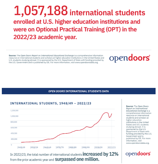 2022-2023,在美国学习的国际生人数同比2022年大增11.5%,总人数达到1,057,188人!同时,在2023年度的国际生报告中,中国和印度依旧是最大生源国前二,两个国家的国际学生整体之和占据总国际生人数的53%。