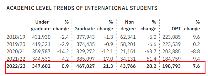 2022-2023学年, 本科国际学生总数增幅终于实现正增长,总数增加了0.9% ,共计在美留学的本科生有347602人。 在之前的四年中,本科新生人数一直是负增长,这也说明大家选择美国本科留学的家庭也越来越多。 研究生数量今年增长继续遥遥领先,2022-2023学年有467027名国际学生在美读研,比上一学年增长21.3%,去年的增幅为17%, 可以看到疫情结束后,大家赴美读研的需求越来越旺盛。
