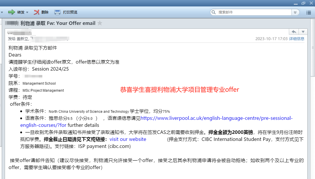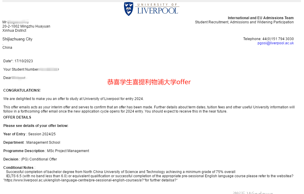 学生背景:华北理工,环境能源专业,均分85,申请时无雅思,录取利物浦大学项目管理专业。