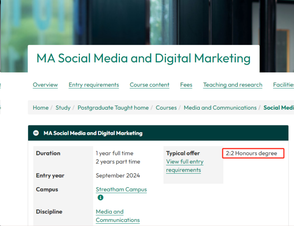 部分商科课程的录取要求调整为英本2:2或同等国际水平,如: