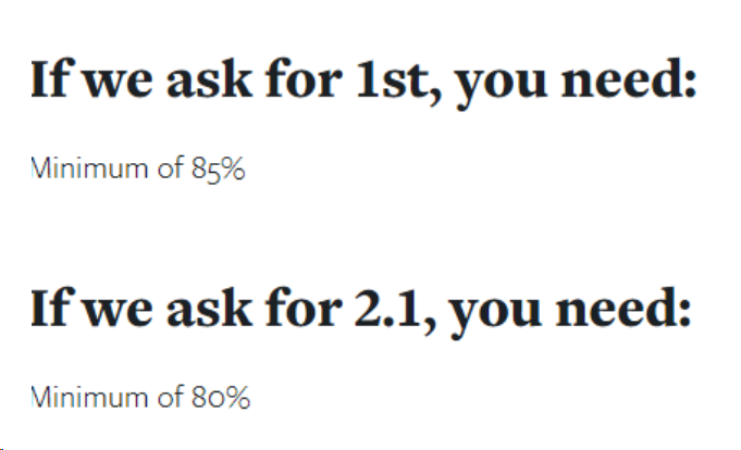 他确实也不打诳语,说到做到。因此今年很多社科专业,上调申请要求到了2:1学位,要知道原来是接受2:2学位申请。