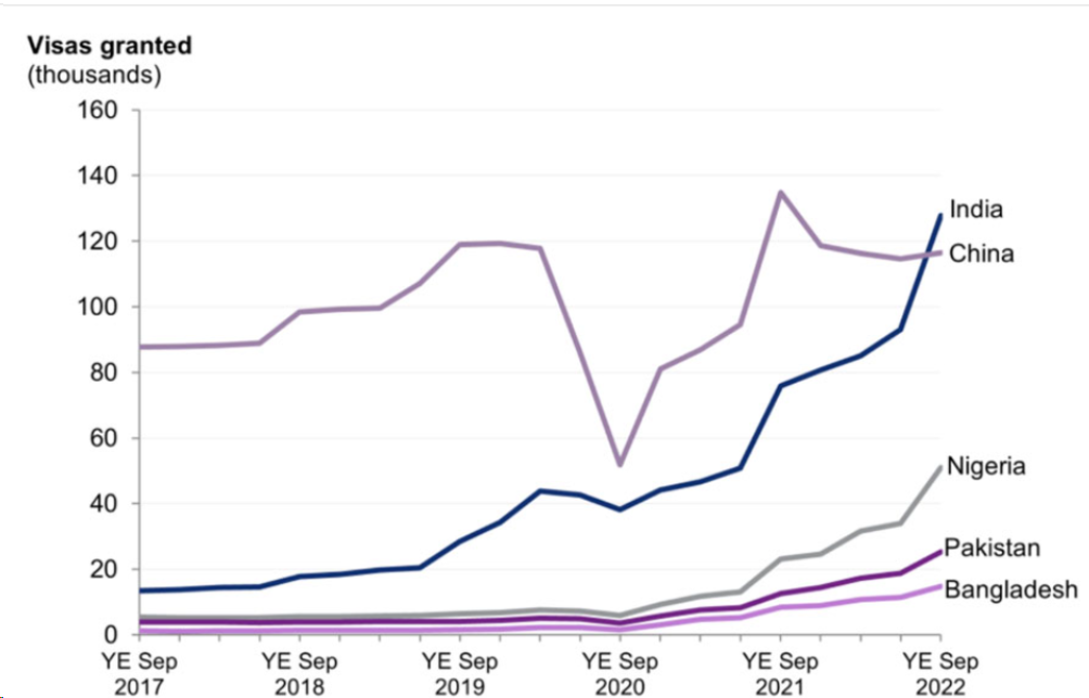 2022年,有77万印度人出国留学,这一数字每年增长约10%。到英国留学人数近两年仍在暴涨,将近14万印度学生选择了英国作为他们的留学目的地。
