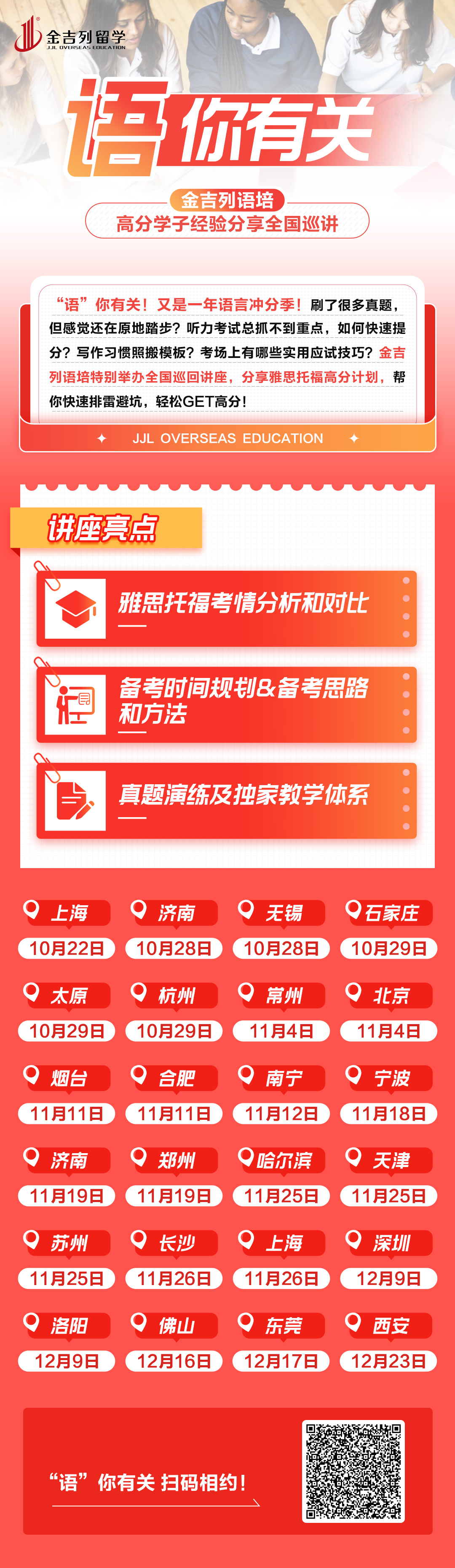 如果你想了解你目前的雅思托福水平,想考高分但不知道怎么做备考规划,那就别错过我们特别举办的“语”你有关--金吉列语培高分学子经验分享全国巡回讲座啦!讲座嘉宾将为你高效解决学习烦恼,帮你快速排雷避坑,轻松get高分!