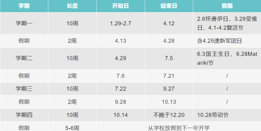 新西兰学年分为四个学期,通常在1月、4月、7月、十月开始,学期长度在9-11周左右,具有一定的灵活性,将根据每年的公共假期时间进行调整。