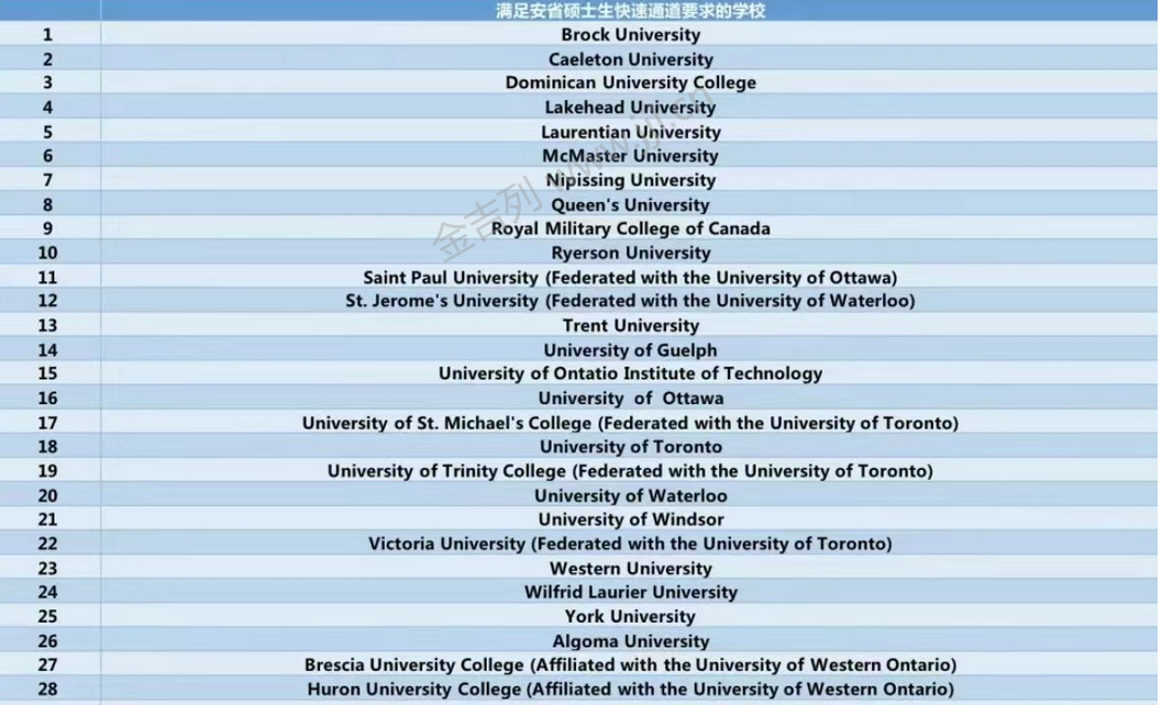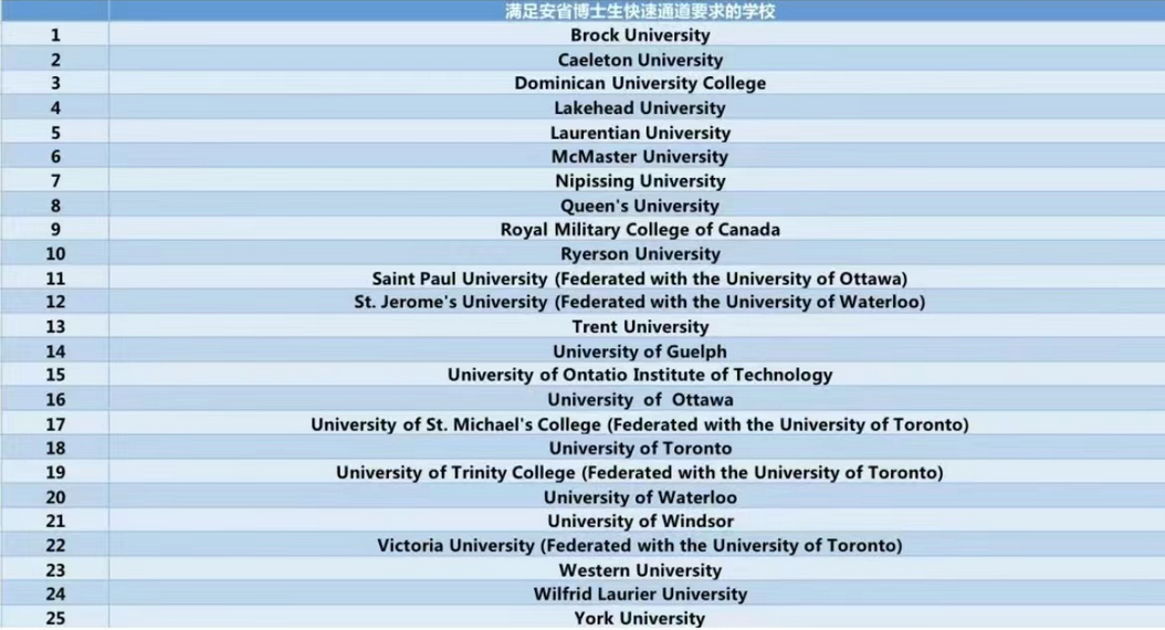 如果博士生毕业需要满足两年全日制学习,应在拿到学位后的两年内递交申请,并且表达定居安省的意愿指定院校:
