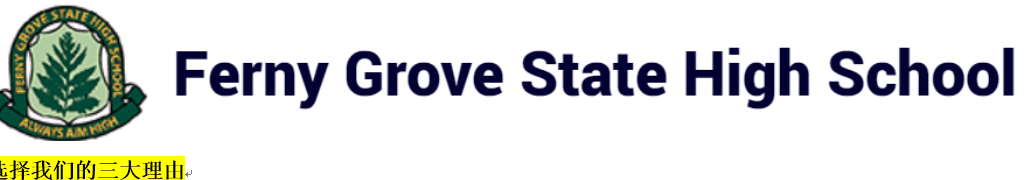 学校概况* 学生人数: 2,000 学校成立年份: 1980 年 学校网站: fernygroveshs.eq.edu.au Ferny Grove 是一所独立的公立学校,因在学术、体育、文化和公民领 域提供高质量的教育机会而享有盛誉。在 Ferny Grove ,我们的愿景是让每个人在学习之路上发现自己的热情。我们将通过制定我们的宗旨声明来实现这一愿景: “ 创造一个包容和尊重的环境,培养有弹性、知识渊博和全球联系的个人 ” 。 学校坐落在 距离布里斯班市中心仅 12 公里 的美丽丛林中,以其强烈的传统价值观而闻名,这些价值观植根于充满关怀和支持的环境中。我们的学校足够大,可以为每个人提供显着的多样性和一些东西,同时确保每个学生都作为一个被鼓励和支持 “ 永远志存高远 ” 的个体而受到重视。 特别节目* 国际知名的器乐和合唱课程( 7-12 年级) 农业( 9-12 年级) 德语沉浸式课程( 7-10 年级) Learning Excellence across Ferny (LEAF) 计划 – 一项带有入学考试的学术计划( 7-9 年级) FAST (弗尼高级运动队)( 7-9 年级) STEMx (科学、技术、工程和数学)( 8-10 年级),可升读 11-12 年级 课外活动* 7 年级营 海外交流 一年一度的滑雪之旅 科科达挑战 弗尼格罗夫科学协会 英语(辩论) 企业日 体育嘉年华(田径、游泳、越野) 语言和文化活动 主题展示活动 生物、戏剧和器乐方面的沉浸式课外体验 学校设施* 新建多功能体育表演中心 农业农场 大型多功能厅和 350 个座位的现代化礼堂,适合表演、讲座和社区活动 最先进的信息和通信技术 (ICT) 设施,包括一对一笔记本电脑计划 卓越学习中心 – 包括 22 个新学习空间、 4 个科学实验室和一个最先进的科学、技术、工程和数学 (STEM) 设计工作室 第三途径**** 昆士兰大学 (UQ) 强化学习课程( 12 年级学习的大学科目) START QUT – 昆士兰科技大学 (QUT) 12 年级学习的大学科目 昆士兰 TAFE 高等教育入学计划 语言 德语 德国加速 / 延伸 印度尼西亚