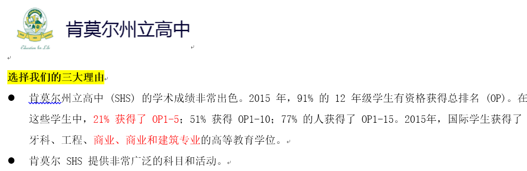 学校概况 学生人数: 1,974 学校成立年份: 1972 年 学校网站: kenmoreshs.eq.edu.au 肯莫尔州立高中是一个具有全球视野的学习社区,致力于帮助学生充分发挥潜力。我们坐落在一个大型校园内,周围环绕着美丽的花园,并且靠近公共交通。 我校在学术、文化和体育领域均取得优异的学生成绩,享有良好的声誉。 专业和敬业的教职员工为我们国际学生的生活做出了巨大贡献,支持和指导学生实现学术目标,并帮助他们规划自己的未来。 我们的国际项目工作人员、教师和管理团队成员共同努力,确保我们的国际学生拥有积极且成功的澳大利亚高中学习经历。我们期待您来到我们学校。 特别节目* 加速数学课程和大学水平数学 高级音乐拓展课程( 7-10 年级) Ken-X 计划( 7-9 年级) 专注于科学、技术、工程和数学 (STEM) 以及 21 世纪的学习能力,包括批判性思维和协作学习 德语沉浸式和扩展课程( 7-12 年级) 福利计划和学生支持服务 英语作为附加语言 / 方言 (EAL/D) 有针对性的支持 昆士兰大学科学大使计划 学生领导机会 一对一学生笔记本电脑计划 课外活动* 国际学生夏令营和短途旅行 器乐和合唱课程(适合各种技能水平): 弦乐团 交响乐队 大乐队 打击乐团 戏剧、舞蹈团、戏剧体育、音乐剧和戏剧节 辩论和公开演讲 各种各样的俱乐部,包括机器人、国际象棋、动漫、艺术、游戏、跑步、太鼓和家庭作业 校际运动会和体育联欢日 EQI 学生辅导 英语、数学和科学学术竞赛,包括澳大利亚计算和语言学奥林匹克 (OzClo) 竞赛 学校设施* 最先进的科学设施 国际学生中心设有休息室、厨房和教学室 影视演播室及演员休息室 现代表演和视觉艺术中心 活动中心 专门建造的初中校区 舞蹈室 第三途径* 早期开始大学课程 昆士兰大学强化研究项目 昆士兰科技大学启动 QUT 课程( 12 年级学习的大学科目) 与格里菲斯大学和阳光海岸大学的联系 语言 德语 德语延伸 日语