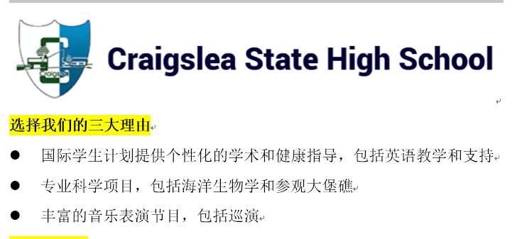 校长的欢迎* 我非常自豪地欢迎您来到克雷格斯利州立高中。我们是一所男女同校的学校,成立于 1975 年,约有 1,000 名学生。 Craigslea 因高学术标准而享有盛誉,教职员工、学生和寄宿家庭真诚致力于确保我们的国际学生享受最高质量的学习体验。我们位于布里斯班市中心附近。 我们有一个长期建立的国际学生项目( 20 年),往届学生对老师和寄宿家庭的满意度非常高 ——100% 的往届学生表示他们会推荐这所学校。 Craigslea 提供优质教育,学生在秩序井然、充满关爱的环境中接受挑战和支持。经验丰富且高素质的教师单独为各种能力水平的学生提供服务。 我们是国际学校理事会的成员。这意味着学校在其运营的各个方面都经过了评估并符合严格的国际基准标准,并且在提供世界一流的教育方面取得了最高水平的表现。 学校概况* 学生人数: 1,100 学校成立年份: 1975 年 学校网站: craigsleashs.eq.edu.au 在克雷格斯利州立高中,我们以高学术标准而享有盛誉。 我们的教职员工、学生和寄宿家庭真诚地致力于确保您接受最高质量的教育并拥有安全和愉快的体验。 我们拥有 25 年历史的国际学生项目, 100% 的往届学生表示会推荐我们的学校,并对我们的老师和寄宿家庭非常满意。 我们的男女同校学校成立于 1975 年,靠近布里斯班市,拥有约 1,100 名学生。 我们是国际学校理事会的成员,这意味着我们符合严格的国际标准,并在提供世界一流的教育方面取得了最佳表现。