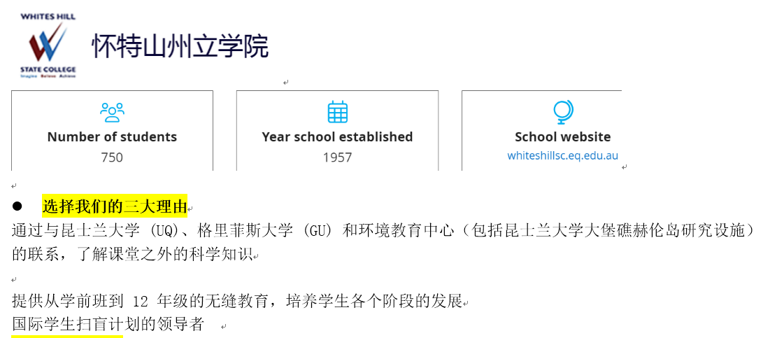 我们的 12 年级预科学院坐落在占地 26 公顷的绿地上, 距离布里斯班市中心仅 8 公里。 凭借我们国际学生参与的历史,我们的学院非常适合您的澳大利亚沉浸式体验。 我们的包容性和支持性文化支持学生的学术和文化成长,同时为所有学生提供关怀支持网络。 怀特山州立学院提供一系列 课外活动,包括科学、技术、工程和数学 (STEM) 、短途旅行、音乐和体育,以增强学生的体验。 我们是布里斯班 三所设有高中预备课程的学校之一。 我们为国际学生提供无缝的教育体验。我们对国际学生的支持从小学到 12 年级都是显而易见的。 怀特山州立大学集群被评为 2022 年昆士兰教育国际展示奖全球参与卓越奖的州获奖者。 特别节目 卓越体育学院——运动健美操和游泳 法语双语课程(预科和一年级) 21 世纪技能的明确教学 出国留学项目 高中预备课程 课外活动 工程课程(机器人、编码和电子等) 校际体育学院和比赛 大堡礁课程扩展计划( 10-11 年级) 家庭作业俱乐部为所有学生提供支持 表演艺术课程,包括器乐、乐队和音乐表演 针对小、中、高学生的显性领导力课程 演讲和戏剧俱乐部(初级) 盆景社(中学) 学术冒险家 生态海洋俱乐部 少年配额俱乐部(小学) 日本学院 中学篮球队和排球队 艺术 / 音乐午餐俱乐部 与击剑俱乐部合作 短途旅行和年度营地 成功参与 Lion Youth Quest—— 公开演讲和领导力计划 通过读书俱乐部融入的机会 学校设施 国际学生中心——艺术与亚洲学习中心 (AALC) 25 米泳池 1,000 个座位的学校礼堂 综合学习中心——包括学院资源中心、演讲厅、技术中心和多媒体室 追求 STEM 相关学习(机器人、 3D 打印)的创新中心 从学前班到 12 年级均可使用设备 最先进的酒店厨房 初级使用 iPad 和电脑、中学在课堂上使用 iPad 、高级个人笔记本电脑 语言 可以使用布里斯班远程教育学校的语言,包括日语 外部考试包括阿拉伯语、韩语、法语、意大利语、汉语普通话和越南语 外部考试可用于大学入学 寄宿家庭和住宿 通过与澳大利亚寄宿家庭一起生活,国际学生成为当地社区的一部分,并有绝佳的机会在安全和充满关爱的家庭环境中练习英语。