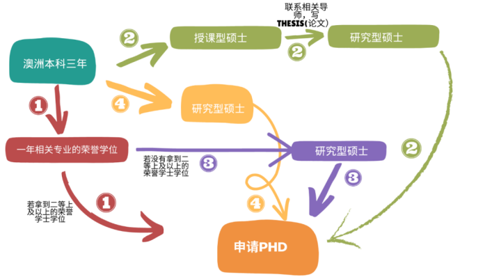 下图将以 澳洲本科三年为起点 ,列出 四条 有机会申请到 博士 的学术路径,希望大家可以找到最贴合自己情况的道路。