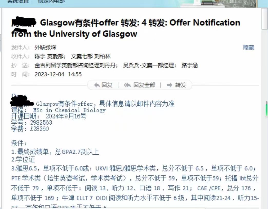 恭喜zyq同学录取格拉斯哥大学化学生物学硕士!!