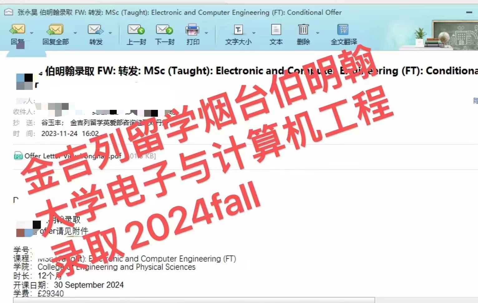 恭喜yh录取伯明翰大学电子与计算机工程硕士!!太开心了!学生背景分享: 山东科技大学 物联网专业 均分81 ,之前妈妈担心孩子拿不到前100的offer,我说请相信金吉列留学,我们足够专业,也会认真把您的需求放在心里,一定会努力,尽力!最终顺利拿到伯明翰大学,世界百强 84名的伯明翰大学的offer!!太棒啦!!