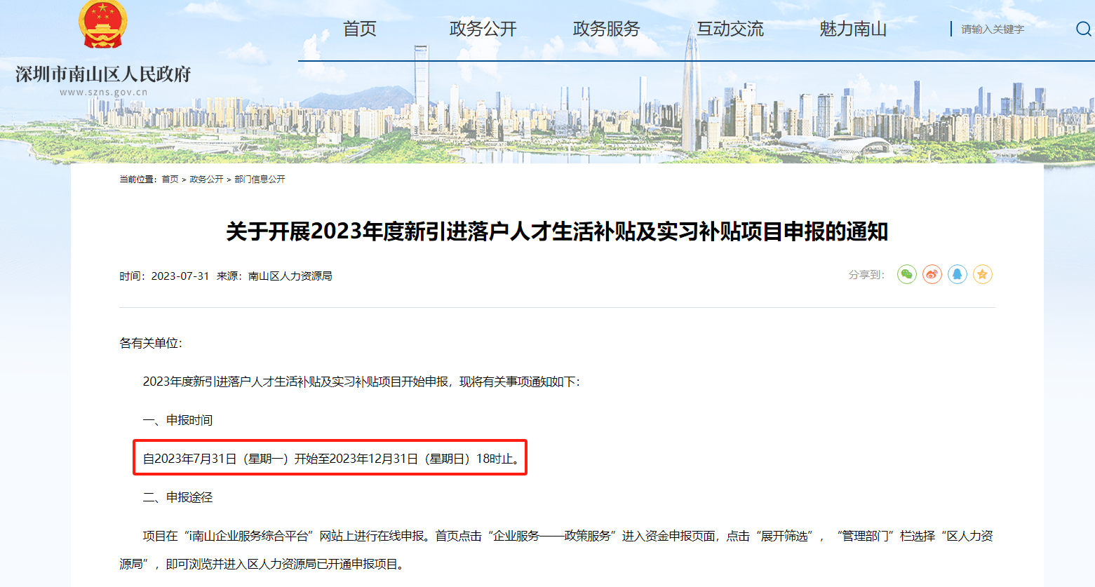 深圳市南山区人民政府2023年度新引进落户人才生活补贴的通知
