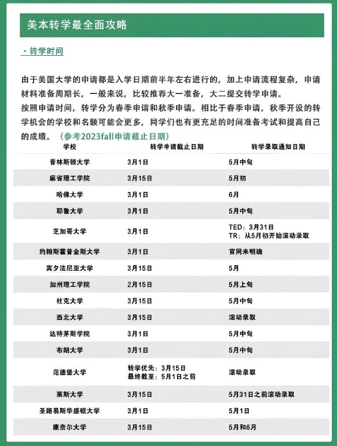 按照申请时间可以把转学申请分为: 春季申请和秋季申请 。其中春季申请一般在10-11月份,个别学校截止日期为9月左右,也有部分院校持续到12月或次年1月,具体要看学校官网。秋季申请一般在入学当年的2月-4月份,最多的集中在3月,部分院校也会持续到5月或者6月中旬。