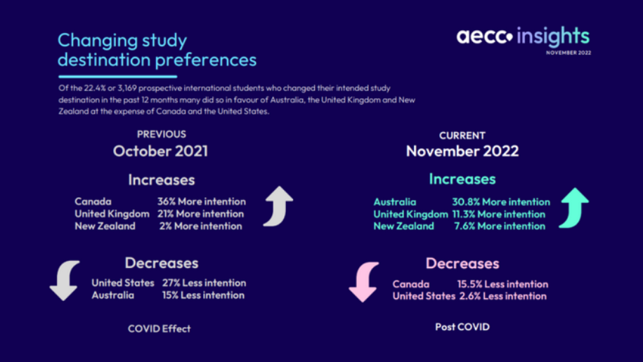 国际教育咨询机构AECC在《2023全球留学趋势报告》数据显示:在过去一年内,22.36%的学生改变了留学目的地意向,其中澳大利亚增长最多,为30.8%;英国留学意向增长11.3%;偏好加拿大和美国的人数稍有下降……整体上,中国大陆地区学生的主流留学目的地还是以英语系国家为主。另外,中国香港和新加坡由于地理位置上的优势,也成功入选留学目的清单!