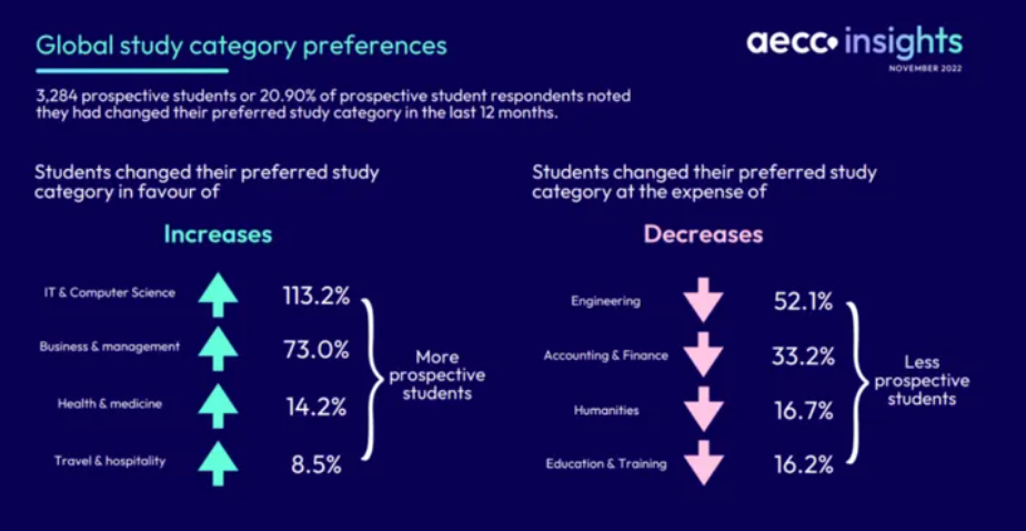 不知道选什么专业的时候,选择热门的也是个不错的办法。近两年,由于大环境的影响,热门专业也发生了变化,AECC《2023全球留学趋势报告》统计出了4个过去1年关注度增长的留学专业,也预示着这些专业是23年申请的热门、竞争可能更激烈。