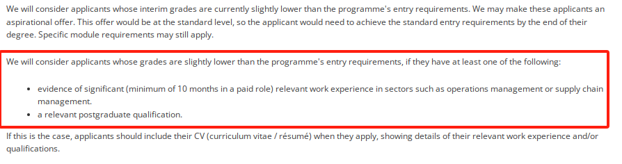 例如 MSc Global Operations and Supply Chain Management 全球运营与供应链管理硕士的录取要求中说“如果学位等级低,但有不少于10个月的带薪工作经验,且工作领域是操作管理或供应链管理;或有相关研究生等级学历”,成绩略低于2:1也可以被考虑。