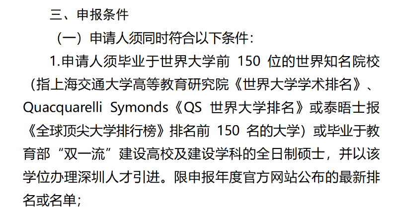 例如深圳市南山区的认定标准是《世界大学学术排名》、QS、泰晤士世界大学排名。