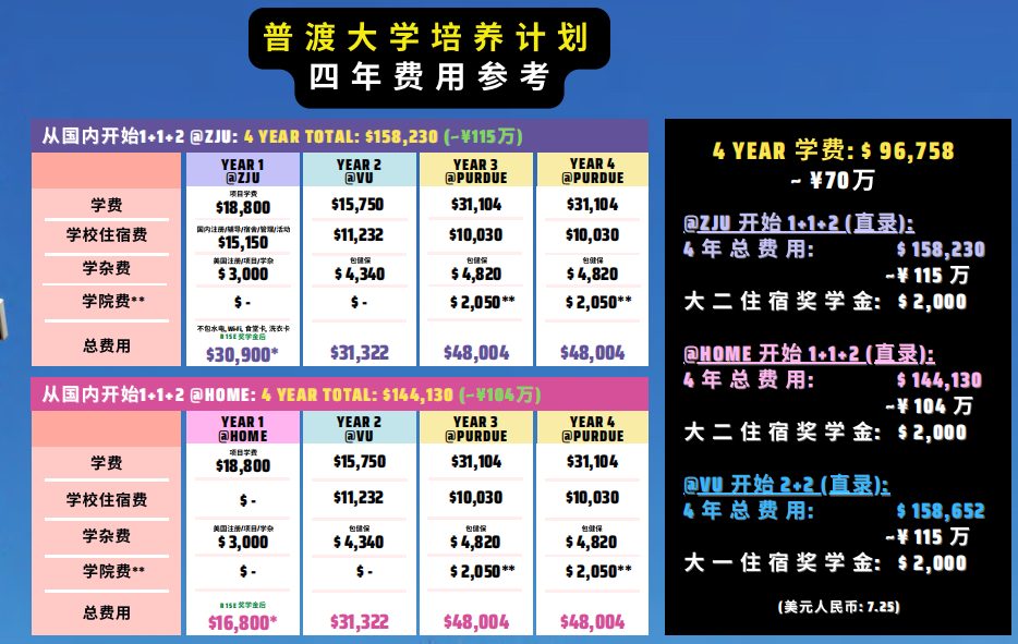 另外就是大家关心的费用问题,本科生的学费大概一年在23万人民币左右!另外普渡大学与我们浙大还有一个1+3的合作项目,四年本科总的花费大约110万人民币左右,属于美本里面比较经济实惠的了!!大家可以重点关注!
