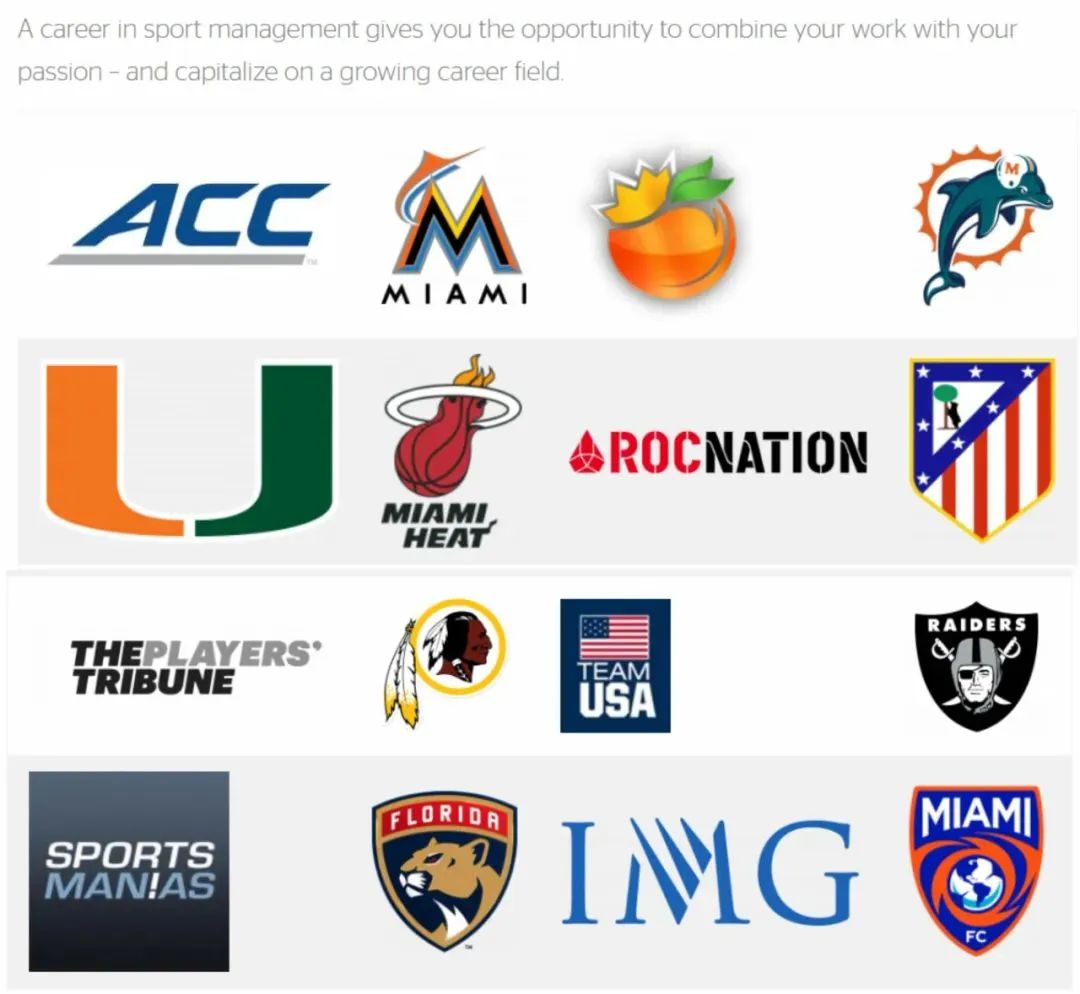 该专业在美国不同院校中,通常有多种表达方式,如“ Sport Management ”、“ Sport Administration ”等, 课程主要涉及 组织管理、市场营销、领导力培养以及法律问题 等方面的专业知识。