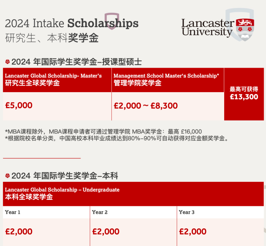 2024-25学年研究生新增奖学金类目兰卡斯特大学国际奖学金-研究生(Lancaster Global Scholarship - Master's)和管理学院研究生奖学金(Management School Master's Scholarship),两类奖学金可叠加获得,最高可获得 £13,300奖学金。