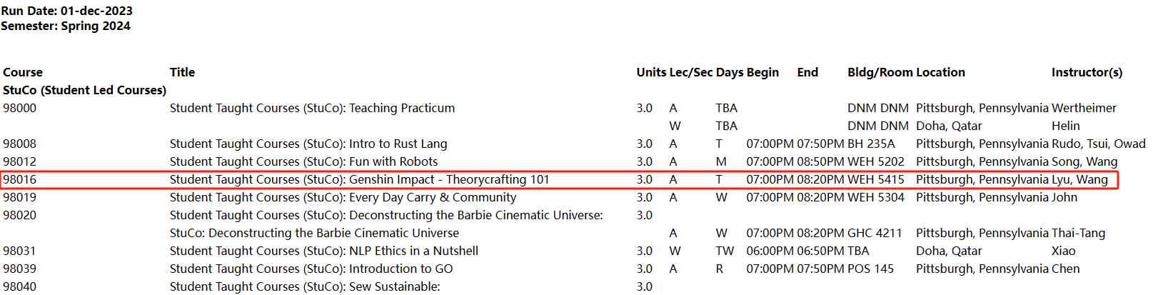 今天咱们也直奔主题,那就是 *美国四大CS名校之一的——卡耐基梅隆大学。* **** 目前在卡梅的官网上,大家可以查到一门名为 *“* Genshin Impact - Theorycrafting 101(原神 - 理论制作101)” 的课程, 在24年春季学期就可以选择进修。