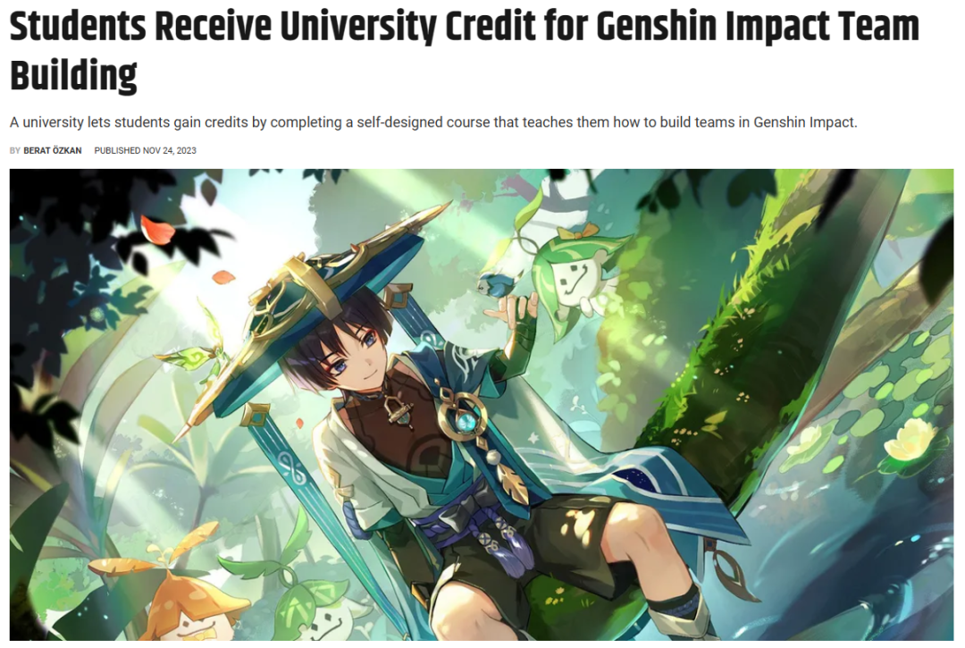 该校让学生通过 完成一门自行设计的课程来获得对应的学分, 而这门课程的主要内容就 是 指导大家在《原神》里组建自己的战斗团队。