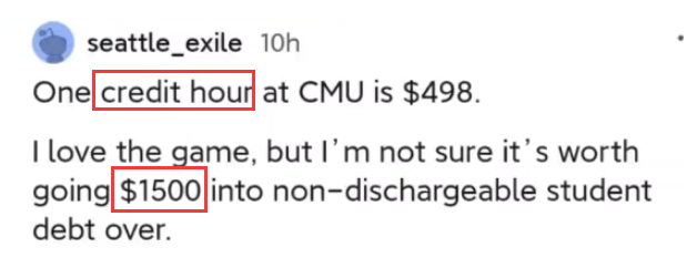 还有同学表示:“卡耐基梅隆大学本来就是她梦想中的大学,现在吸引力更大了。” 有赞同,就有质疑。 有的同学可能会觉得, “上课玩游戏,还要收学费?” 这会降低大家对分数的重视程度, 一个学分的课程需要498美元,那么这个3学分的课程 理论上的学费便高达1500美元!