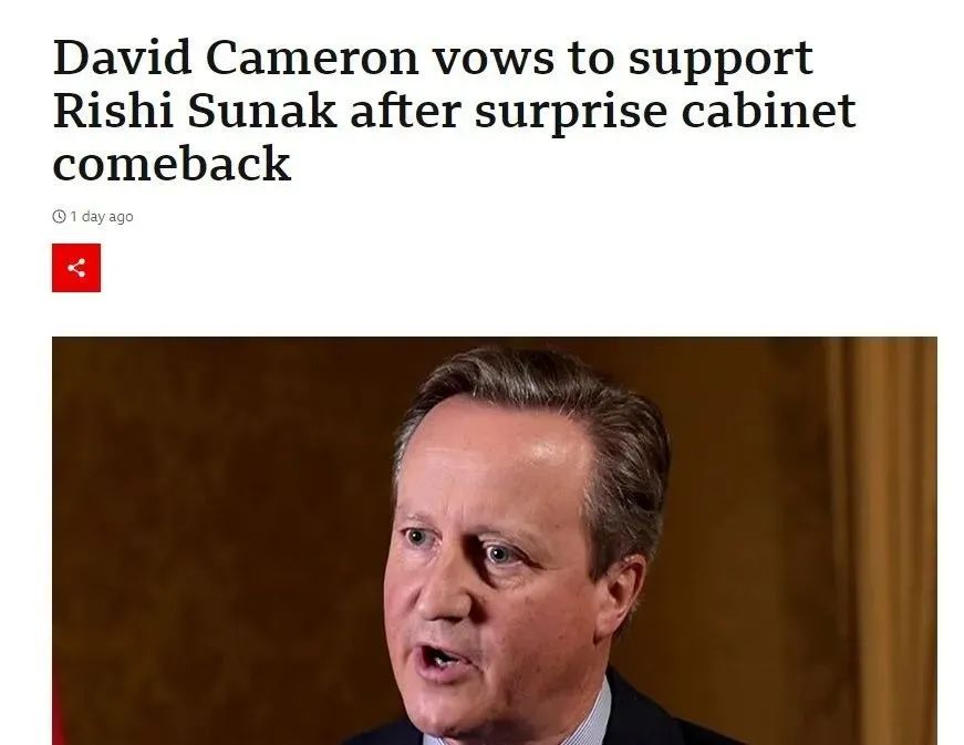 在苏拉·布雷弗曼离开后,英国首相办公室最新宣布,英国前首相卡梅伦被任命为英国外交大臣。