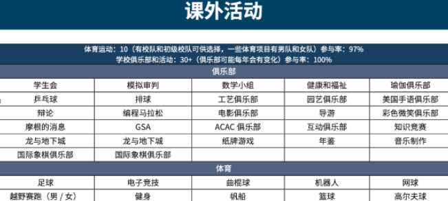 学校每年有 20-30个学生俱乐部供学生参加,其中包括学术类的语言俱乐部、数学、辩论等俱乐部;社交类的烹饪、乒乓球、社区服务等俱乐部;还有竞技类的俱乐部。同时,学校还提供许多课外活动供学生选择。学生在校期间必须参加两个赛季的活动。