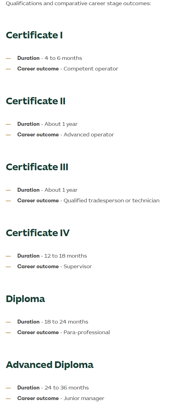 VET 提供的教育学历主要是证书(Certificate)和文凭(Diploma)两大类,也有部分机构会提供少量的本科学位。
