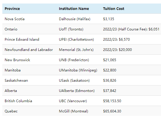 所有 10 个被评估的大学都提供与人力资源相关的课程,尽管一些机构提供完整的四年制本科课程,而其他机构提供可以在不到一年内完成的证书课程。 所有 10 个被评估的大学都提供计算机科学课程,其中最便宜的是由 达尔豪斯、UofT 和 UPEI 提供。 Dalhousie 注:Dalhousie 的人力资源管理证书课程包括三门课程,每门课程为期 12 周 UofT 注意:UofT 为其人力资源管理证书课程提供半门课程费用估算 在评估的十个最受欢迎的学校中,麦吉尔大学(攻读商业学士学位的学生估计每年的学费约为 65,604.30加元)和 UBC 提供该领域最昂贵的两个项目,攻读商业学士学位的学生每年的本科国际学生学费为 58,153.50 加元。 下表列出了所有 10 个评估的 DLI。