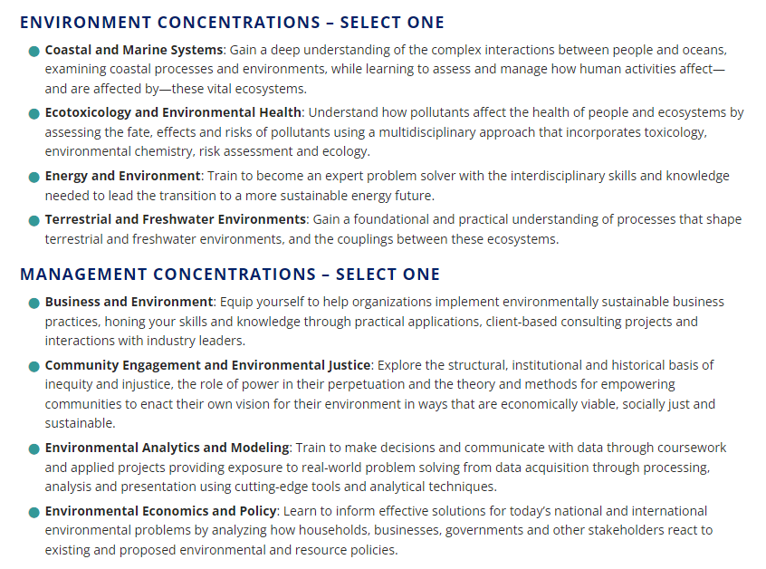 该项目有多个concentration可以选择:环境生物学、环境政策、环境复原力与适应性、环境可持续性、资源管理以及城市环境。