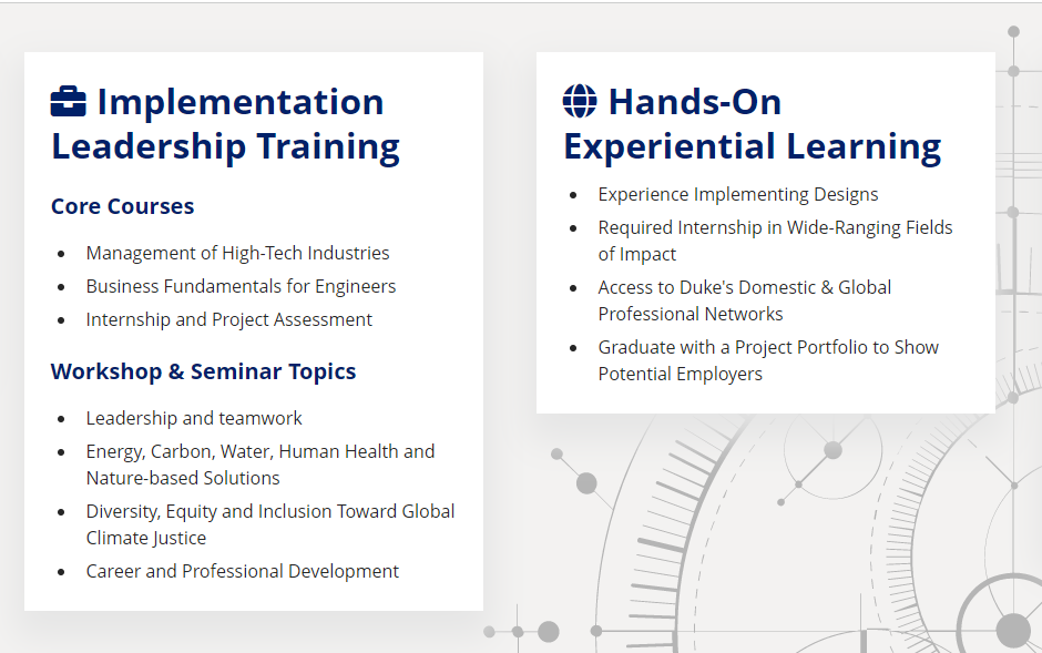 杜克大学工学院本年度新开了ESG项目。该项目将加强学生的技术分析和设计技能,并应用于变幻莫测的气候挑战。该项目非常强调商业基础、高科技产业管理和专业实习。