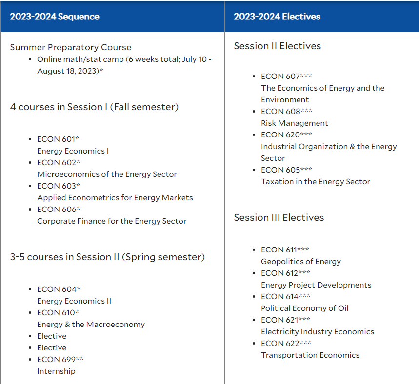 这个一年制的硕士项目旨在教育未来能源领域的领导者和战略思想家,通过涵盖计量经济学、企业金融、能源转型、微观和宏观经济学、风险管理、能源交易、能源和环境、政治经济学、地缘政治、能源项目管理、运输、税收等方面的课程,培养学生在能源行业的所有领域提供战略性、洞察力和数据驱动的见解。