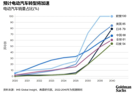 随着全球加速推进净零碳排放,电动汽车使用率急剧上升。根据高盛研究部数据,2035年电动汽车将占全球新车销量的一半左右。