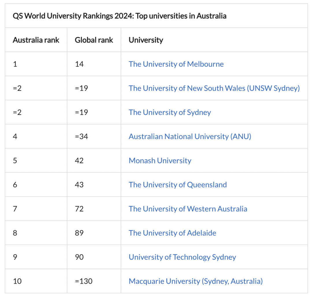 越来越多的留学生涌入澳洲,给澳洲的租房、基础设施、劳动力市场都带来了一定的压力。 这也引发了人们的担心,有专家担心现在疲软的经济可能会让一些年轻工人变得脆弱,并威胁到大学部门。 而这几组数据的公布恰逢2024年QS世界大学排名的发布。 6月28日,QS2024世界大学排名公布,澳洲高校可谓是最大赢家,整体排名大进步。 作为中国最看重的世界大学排名,此排名一出,澳洲高校们可以说在留学圈彻底抬起了头,澳洲已经拥有3所世界前20。