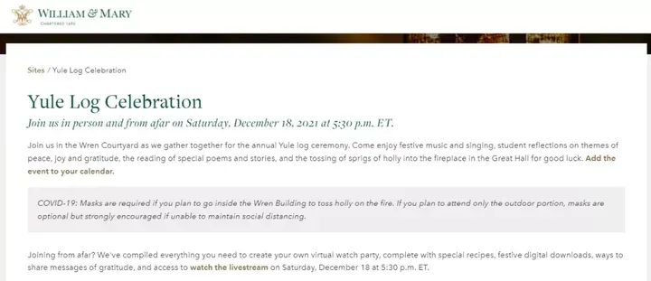 而在威廉玛丽学院,这个传统则演化成了一个隆重的庆典。学生们点起篝火,在火边唱歌、读诗,然后向火中投入冬青树枝,祈求好运和平安。