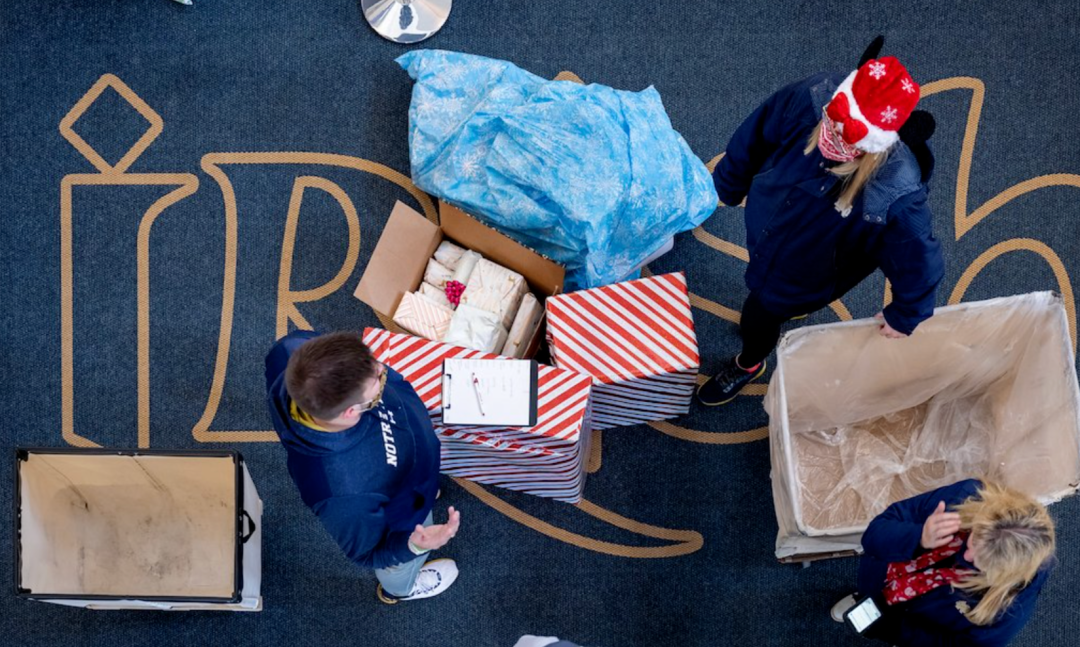 在该活动中,圣母大学体育部的团队成员、职员、以及教练共同参与,与当地家庭配对,为他们提供节日所需的食品,并在圣诞树下摆放礼物。