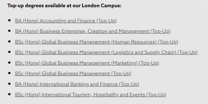 另外,开设TOP-UP申请的英国大学并不多,可供选择的专业也比较有限,以商科专业为主。